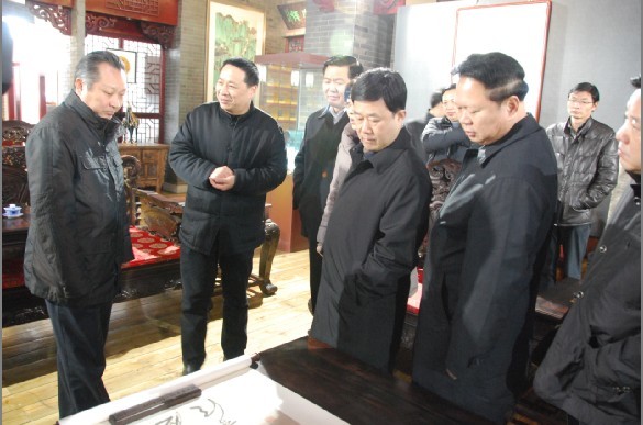 市文廣新局許新建局長(左一)陪同市委書記、市人大主任趙鵬(左二)、市委常委、秘書長戴元湖(右二)、市委常委、宣傳部長陳紅紅(右一)等一行參觀考察文化藝術(shù)中心。