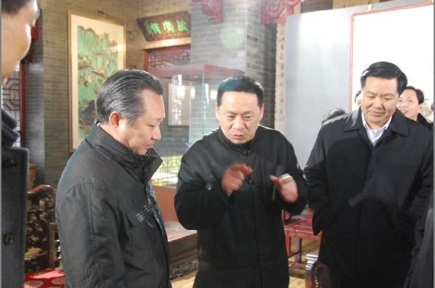 市委書記、市人大主任趙鵬(左一)、副市長朱傳耿(右一)等領(lǐng)導(dǎo)現(xiàn)場聽取市演藝集團(tuán)總經(jīng)理曹利衛(wèi)同志(中)介紹錦龍?zhí)梦幕a(chǎn)業(yè)項(xiàng)目情況。