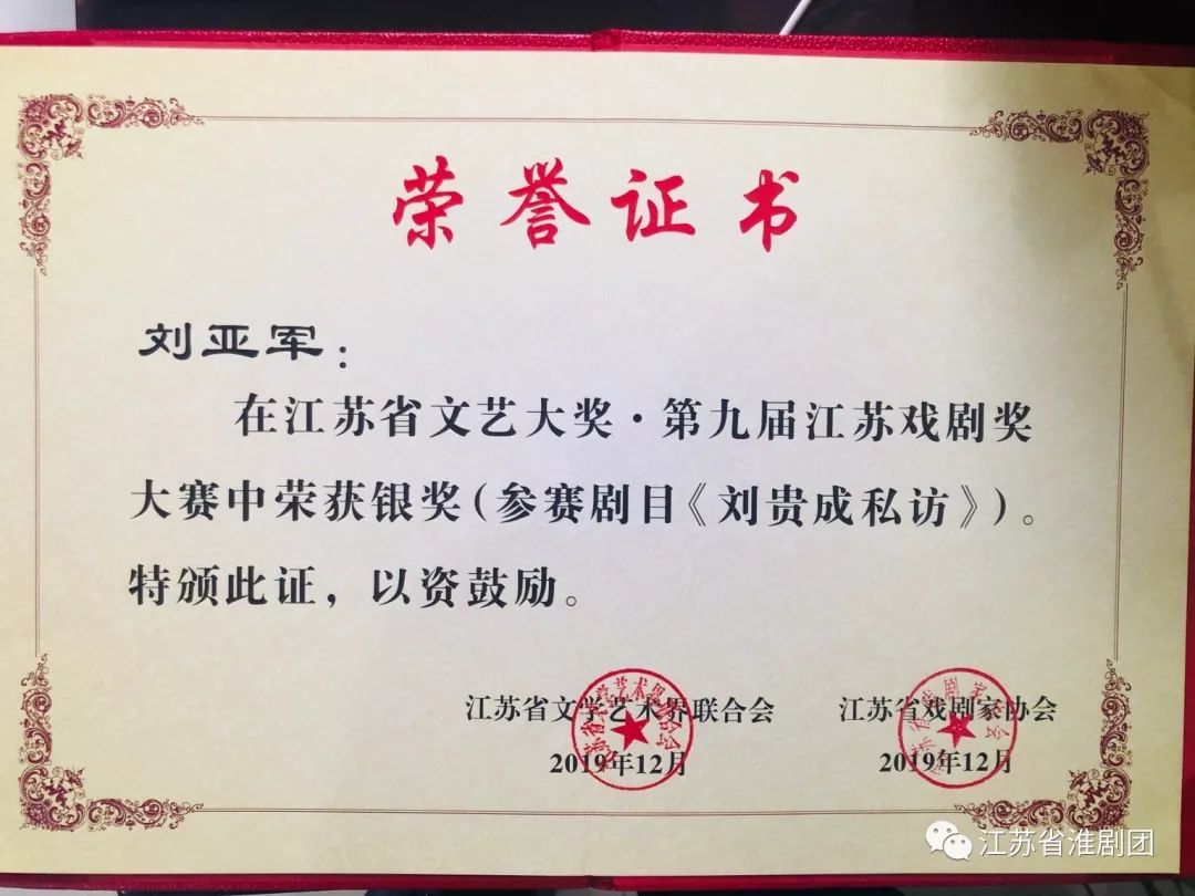 本屆江蘇省文藝大獎·戲劇獎于8月至12月舉行,共有11地市192名選手報名參賽。經(jīng)過初評、復(fù)評以及最后的決賽,共36名青年演員脫穎而出,分別獲得金銀銅獎。祝賀江蘇省淮劇團(tuán)青年演員張泠、劉亞軍獲得第六屆江蘇戲劇獎銀獎,江蘇省淮劇團(tuán)青年演員王登洲獲得第六屆江蘇戲劇獎銅獎。